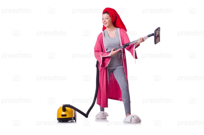 Женщина с пылесосом на белом фоне