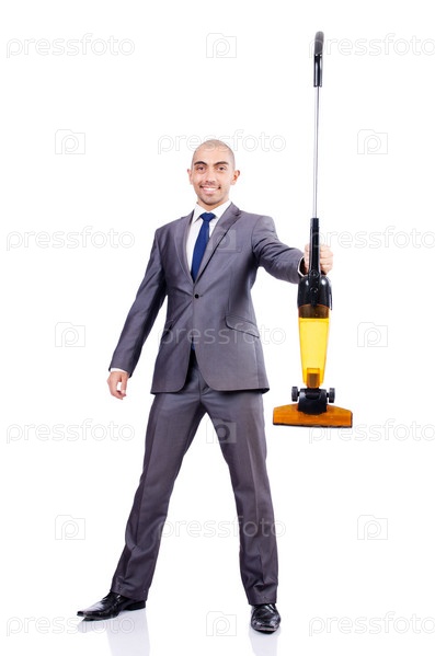 Бизнесмен с пылесосом на белом