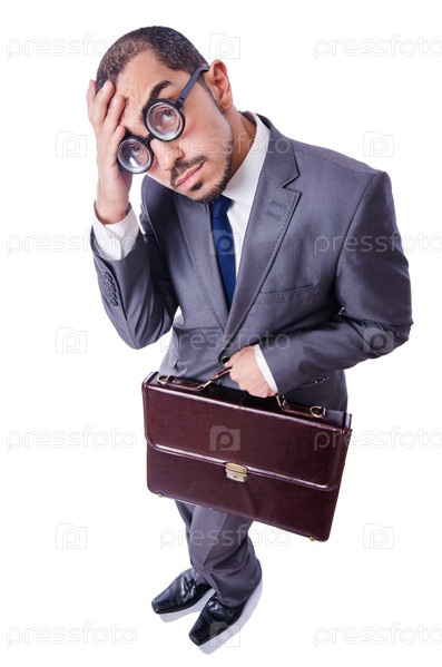 Смешной бизнесмен-ботаник, изолированный на белом