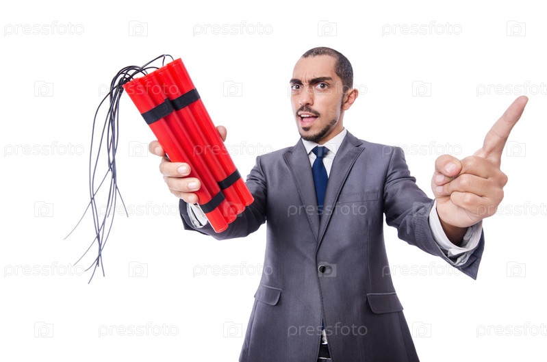Бизнесмен с динамитом, изолированный на белом
