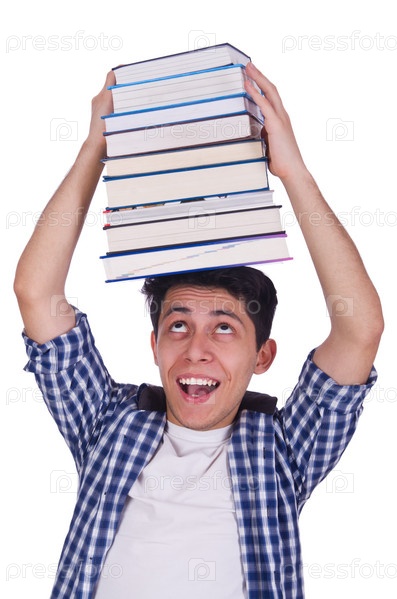Смешной студент с стопкой книг