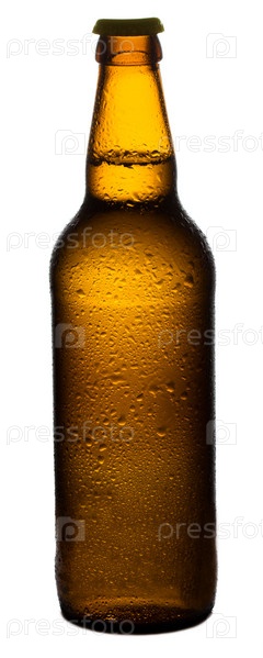 Коричневая бутылка пива, изолированная на белом фоне. Путь отсечения