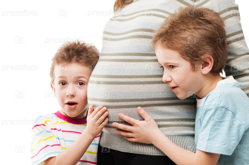 Два маленьких сына касаются живота беременной матери