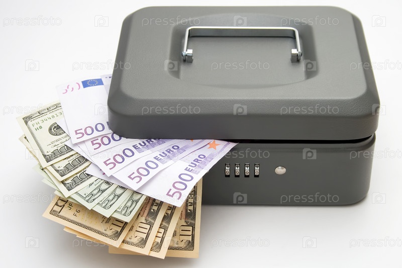 Закрытый кассовый ящик с деньгами на белом фоне