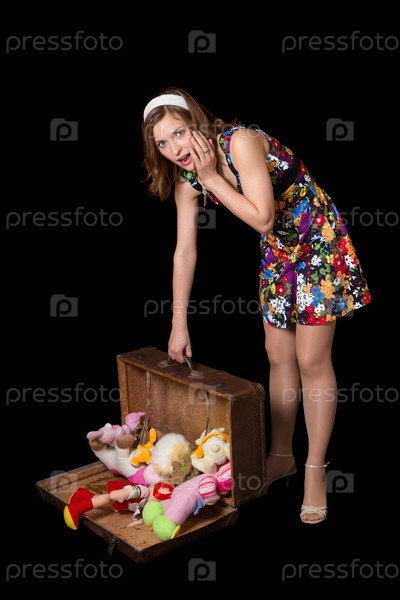 Девушка в стиле пин-ап со старым открытым чемоданом