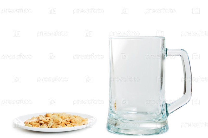Пустой стакан пива и блюдце с арахисом