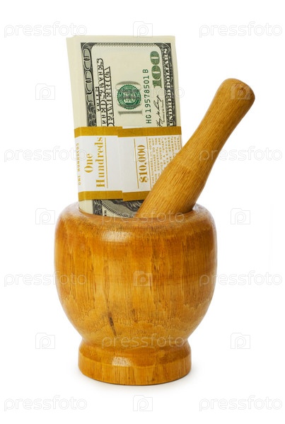 Деньги в ступке на белом фоне