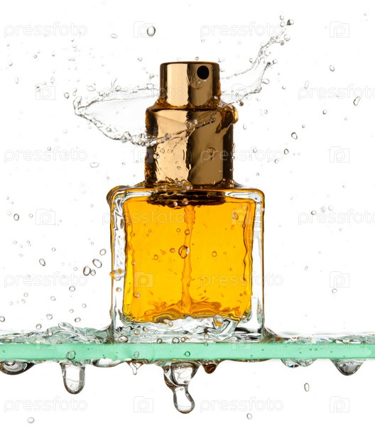 Маленький прямоугольной флакон духов в брызгах воды на белом фоне