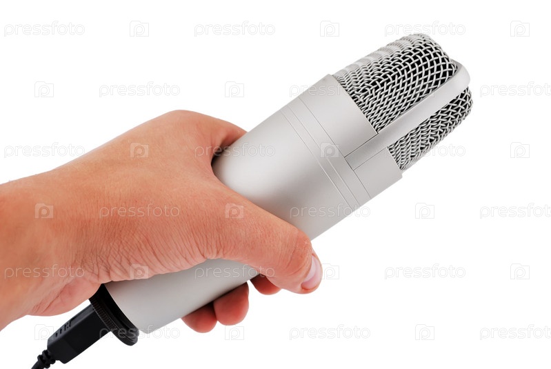 Профессиональный микрофон в руке на белом фоне