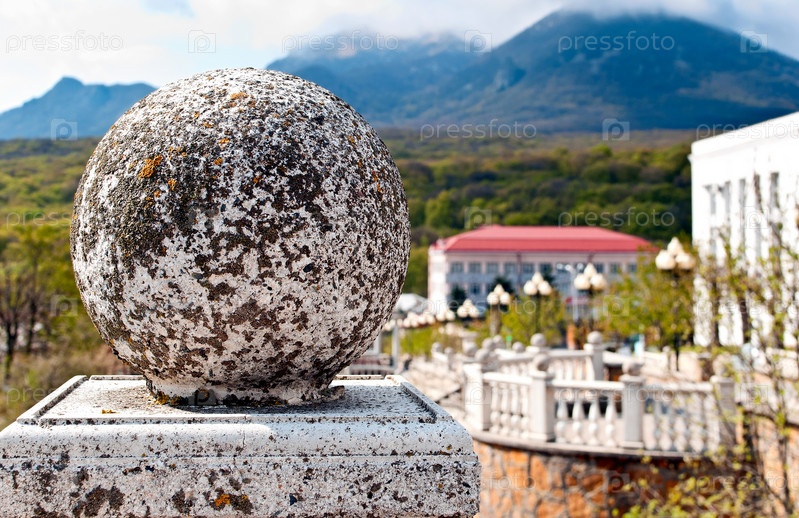 Каменный шар от старинных перил на фоне гор