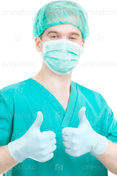 Уверенный молодой врач с жестом "Отлично" на белом фоне