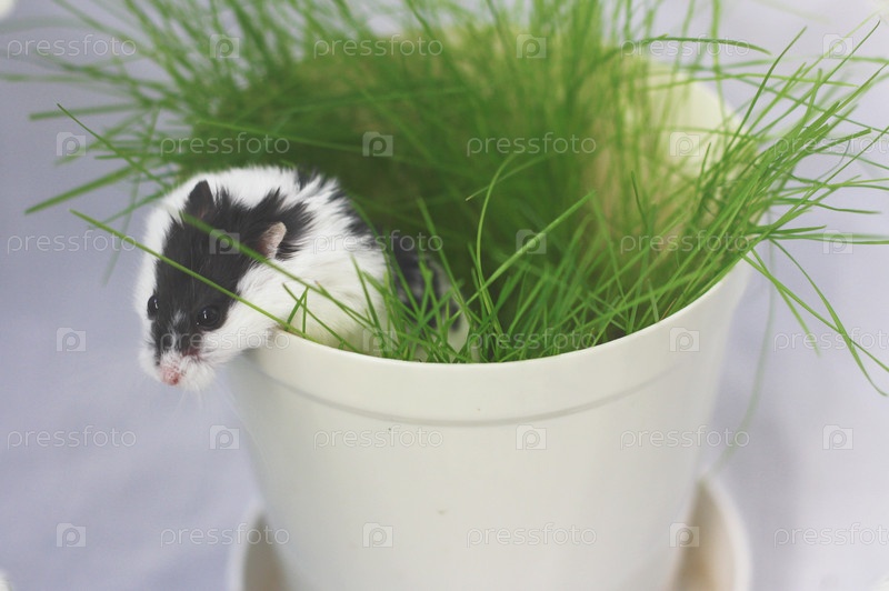 Хомяк сидит в горшке с травой