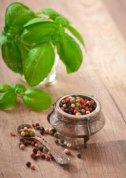 Смесь перца в старой миске и листья базилика