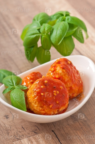 Фрикадельки в томатном соусе, украшенные листьями базилика