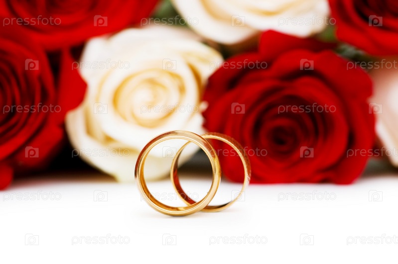 Розы и обручальные кольца, изолированные на белом