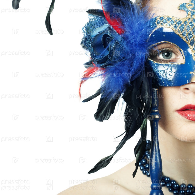 Красивая девушка в маскарадной маске на белом фоне