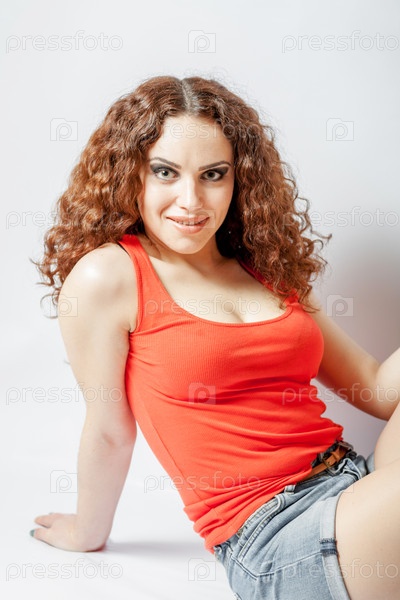 Кудрявая брюнетка в красной майке на белом фоне