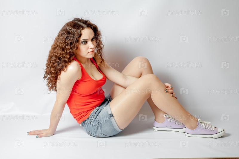 Кудрявая девушка в красной майке сидит на белом фоне