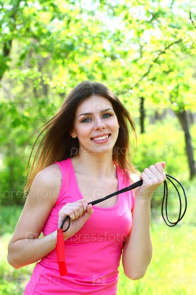 Улыбающаяся молодая женщина позирует со скакалкой в летнем парке
