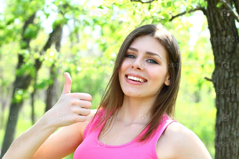 Хорошенькая улыбающаяся девушка показывает большой палец на на фоне зеленого летнего парка