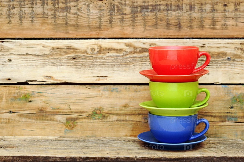 Красочные кофейные кружки на деревянном фоне