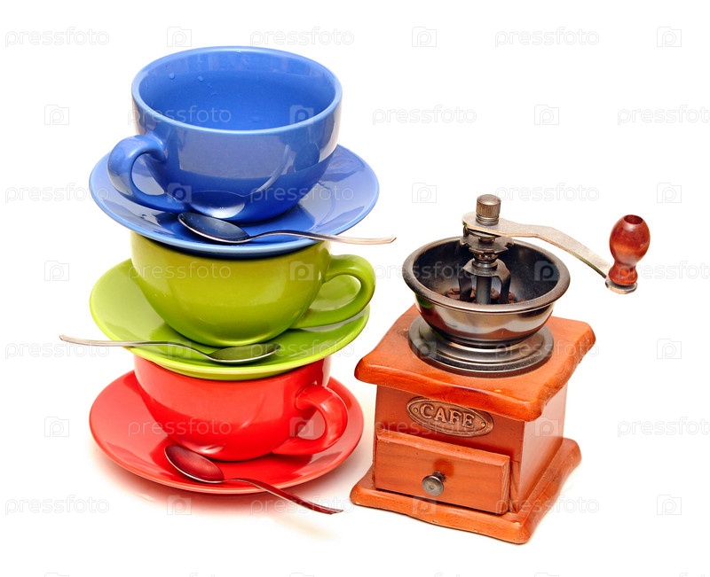 Красочные кофейные кружки и кофемолка, изолированные на белом фоне
