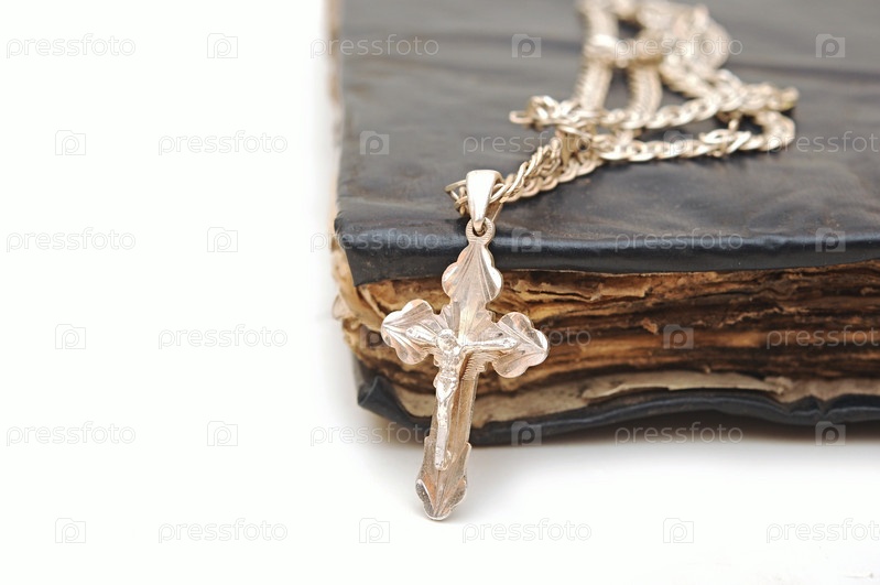 Религия. Крест с цепочкой на старой книге