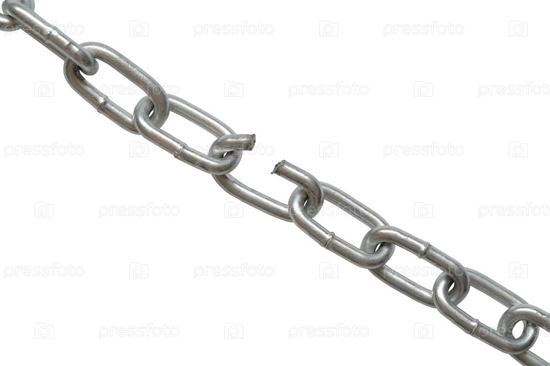 Цепь с разорванным звеном на белом фоне
