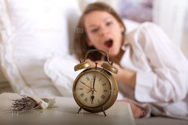 Будильник на столе и спящая женщина