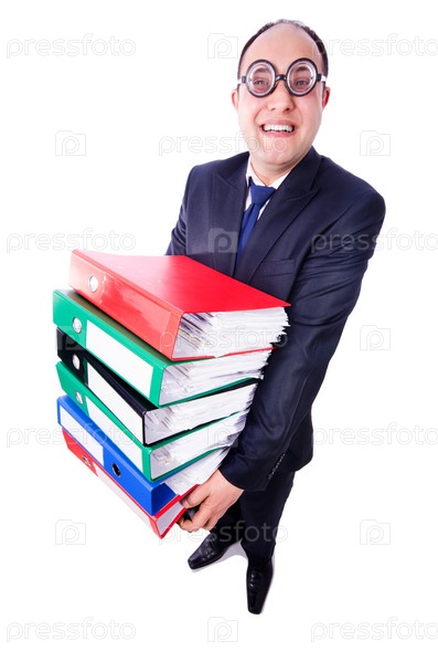 Забавный мужчина с большим количеством документов на белом фоне