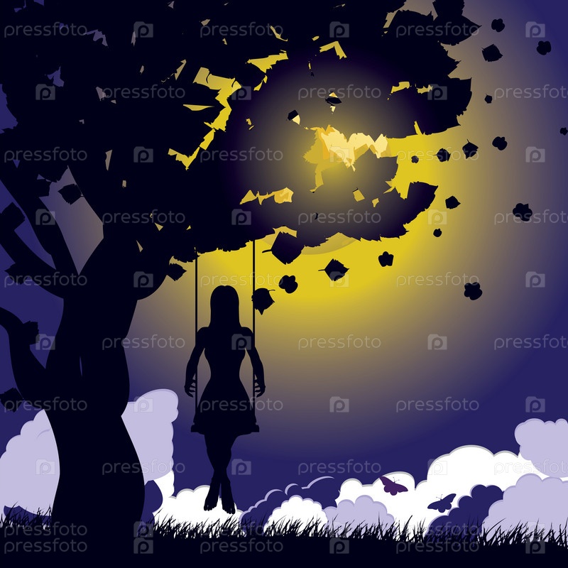 Силуэт девушки на качелях ночью