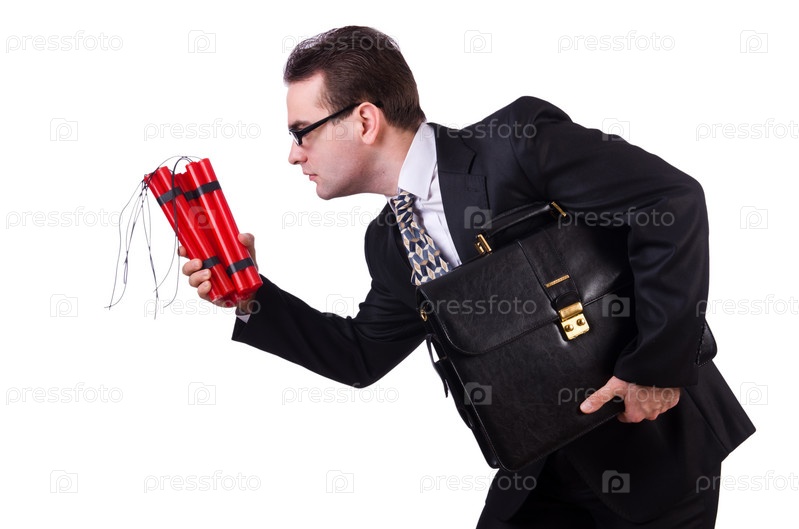 Бизнесмен с динамитом, изолированный на белом