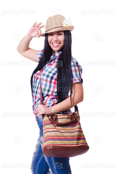 Молодая женщина готова к летним каникулам на белом фоне