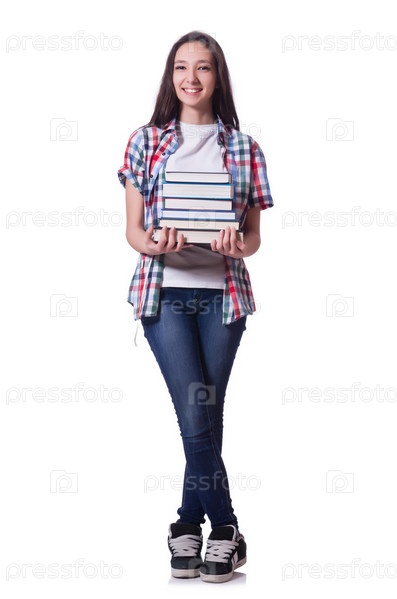 Студентка с книгами на белом