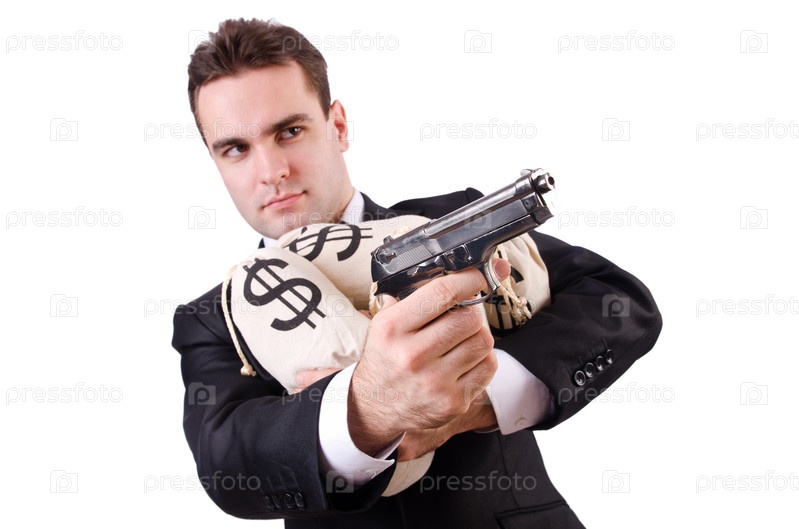 Мужчина с пистолетом и мешками денег