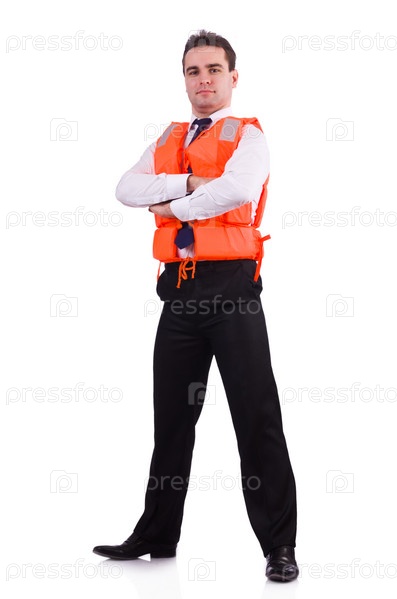 Бизнесмен в спасательном жилете на белом фоне