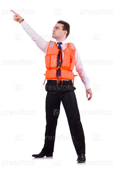 Бизнесмен в спасательном жилете на белом фоне