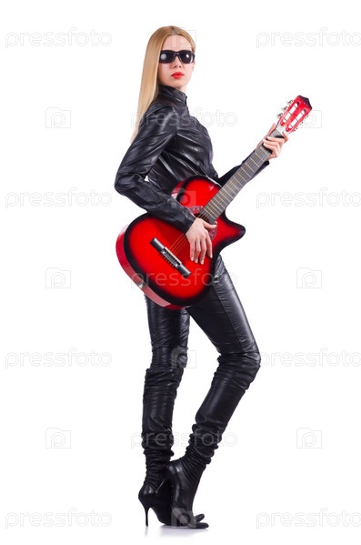 Женщина гитарист в кожаном костюме