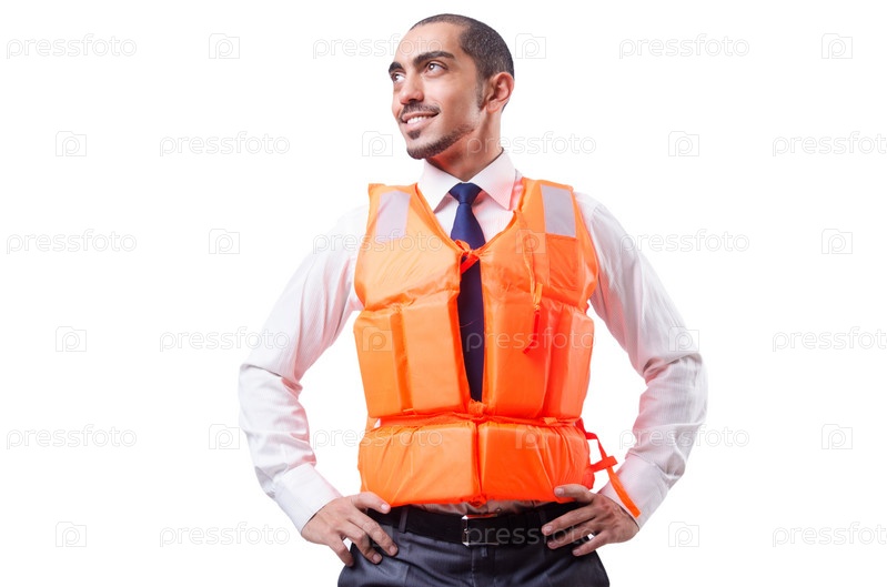 Человек в спасательном жилете, изолированный на белом