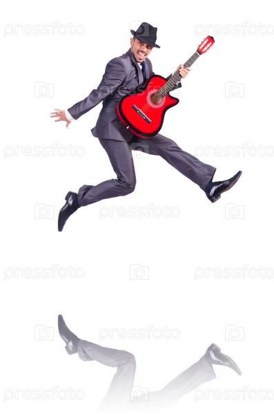 Бизнесмен с гитарой, изолированный на белом