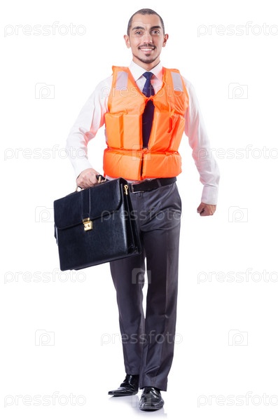 Человек в спасательном жилете, изолированный на белом