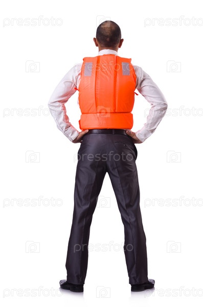 Человек в спасательном жилете, изолированный на белом фоне