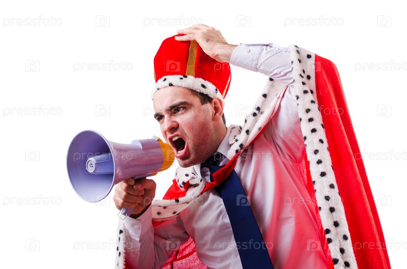 Король-бизнесмен с громкоговорителем, изолированный на белом фоне