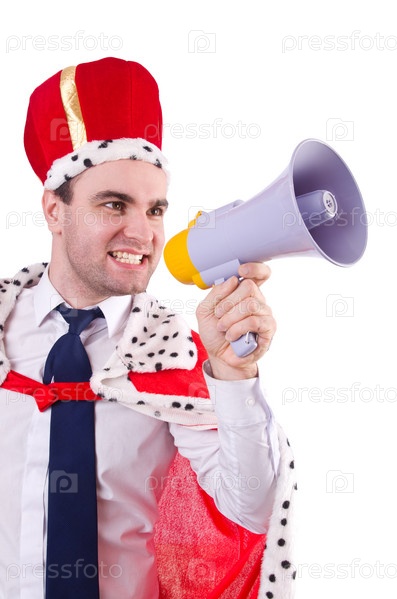 Король-бизнесмен с громкоговорителем, изолированный на белом фоне
