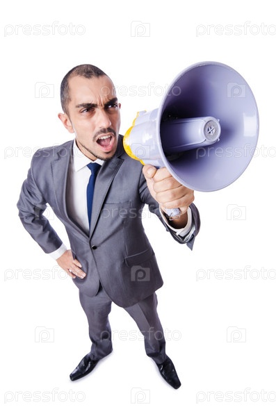 Молодой предприниматель с громкоговорителем на белом