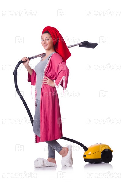 Женщина с пылесосом на белом фоне