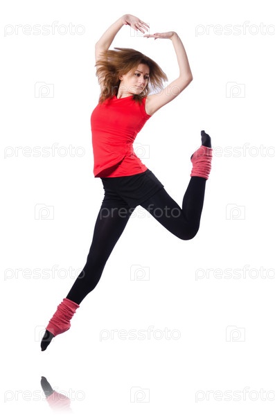 Молодая гимнастка тренируется на белом фоне