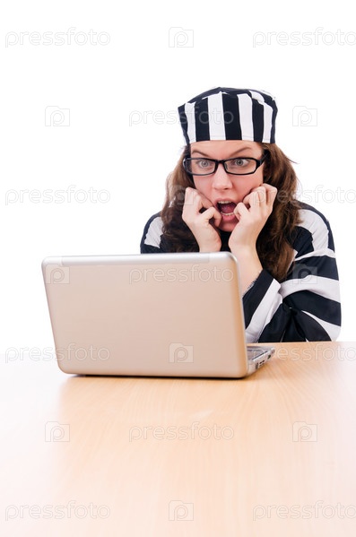 Хакер преступник с ноутбуком на белом