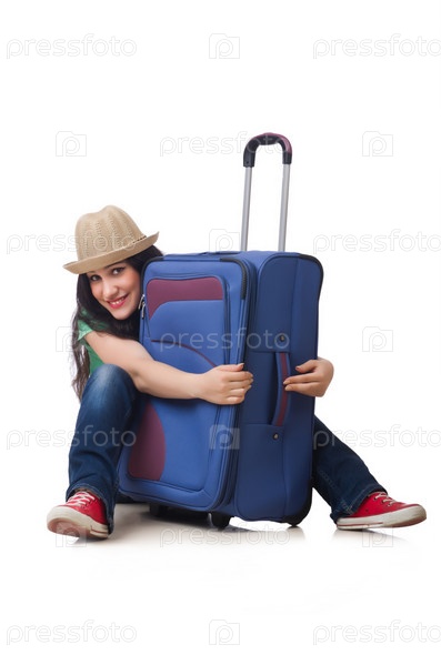 Молодая женщина с чемоданом, изолированная на белом