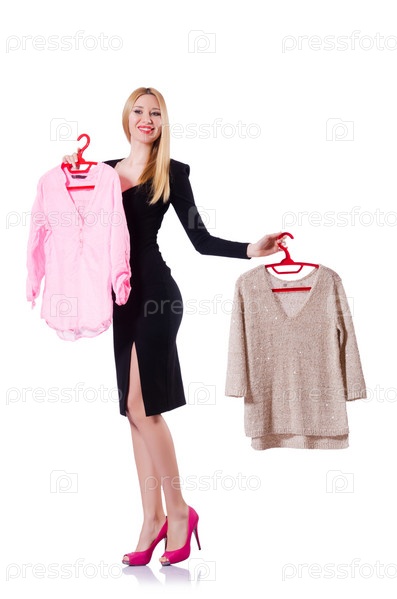 Женщина пытается выбрать платье на белом фоне